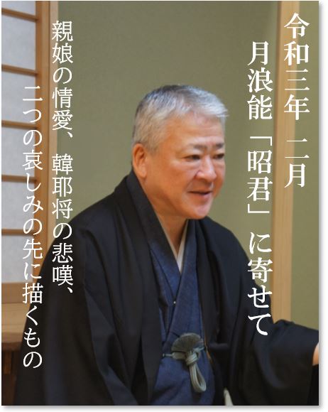 漢と匈奴の戦いは一進一退を繰り返し、力に勝る匈奴の王韓耶将単于(後シテ)の妃に漢王の後宮から一人差し出す事になります