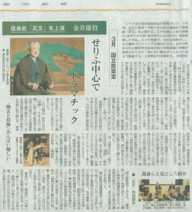 ●雄資師 「復曲能『武文』上演」について東京新聞の記事を掲載しました