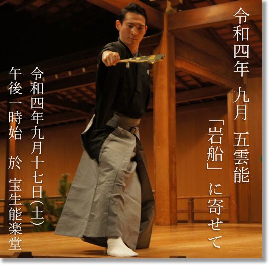 どちらにしろ、能自体は祝言のめでたい雰囲気で恙なく進行します。雲を駆ける岩船、高波のなかうねるように飛ぶ龍神、降り注ぐ財宝を、巧みに想像しながら楽しんで頂きたく存じます。